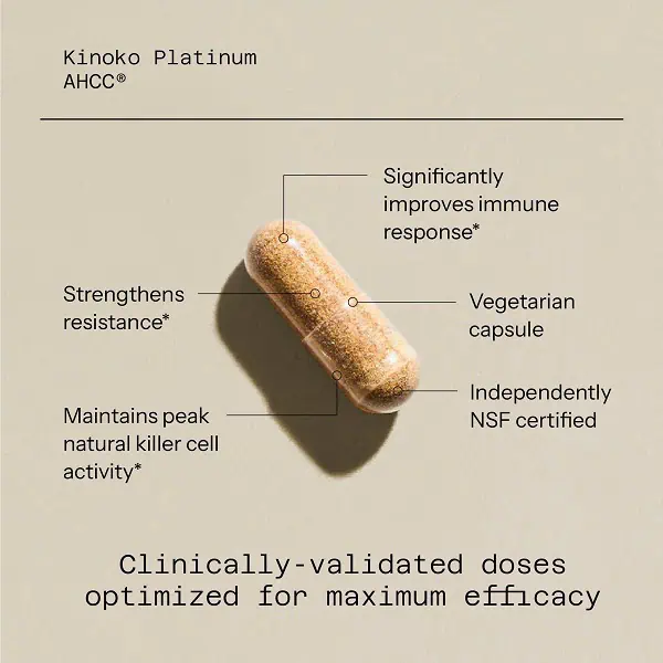 سایر مواد تشکیل دهنده: سلولز گیاهی و لوسین. هر کپسول گیاهی Kinoko® Platinum AHCC® 750 میلیگرم AHCC® را ارائه میکند، که دستیابی به دوز 3 گرم روزانه توصیه شده در زمانهای افزایش چالشهای ایمنی را آسانتر و راحتتر میکند.
