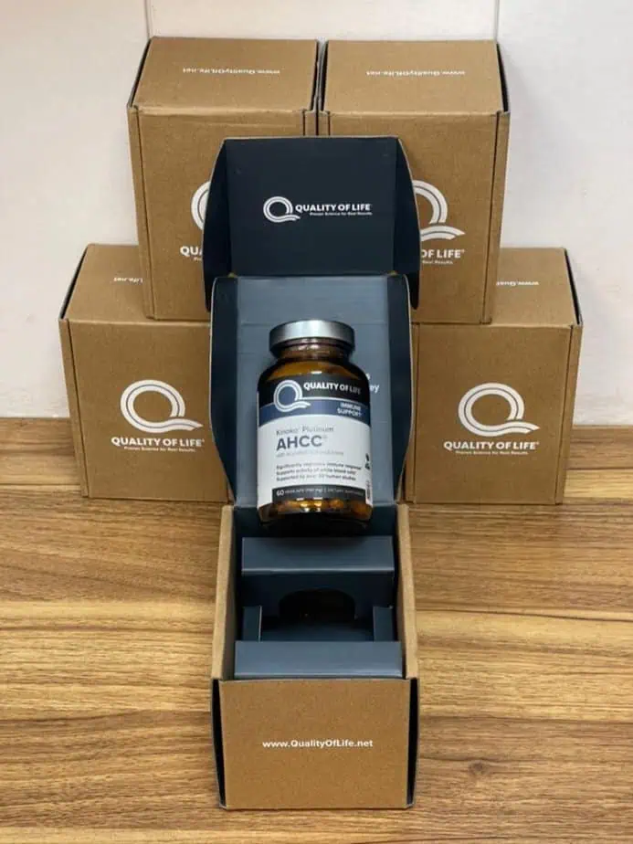 از یک مواد اولیه برای Kinoko® Gold و Kinoko® Platinum AHCC® استفاده می شود. تنها تفاوت این است که Kinoko® Gold حاوی 500 میلی گرم AHCC® در هر کپسول است، در حالی که Kinoko® Platinum حاوی 750 میلی گرم AHCC® در هر کپسول است.